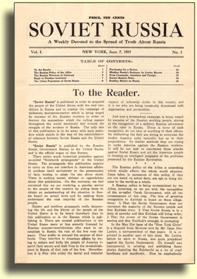The Russian Soviet Government Bureau came to the view that an expanded magazine targeted to a broader readership was called for, and on June 7, 1919, a 16-page magazine called Soviet Russia: A Weekly Devoted to Spread the Truth About Russia was launched. According to its editor, Soviet Russia was intended "to acquaint the People of the United States with the real conditions in Russia and to combat the campaign of deliberate misrepresentation which is being waged by enemies of the Russian workers..." The magazine was intended to be the voice of the Soviet government abroad rather than a tool of the domestic American communist movement. "There is nothing secret, sinister, or opprobrious about this publication," the editor asserted. On the contrary, it was contended that a handful of publications "more or less secretly financed by Russian counter-revolutionists" were the ones responsible for the real "sinister and insidious propaganda" -- an effort to "seduce and bully the people of America to spend their money and their lives in the reestablishment in Russia of that rule of the few."