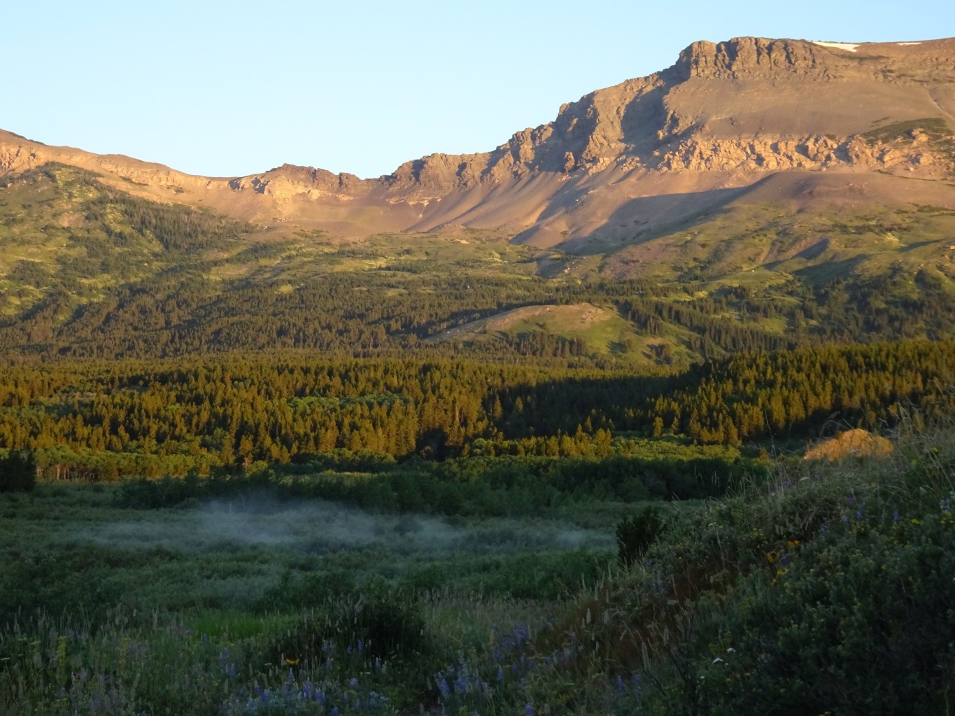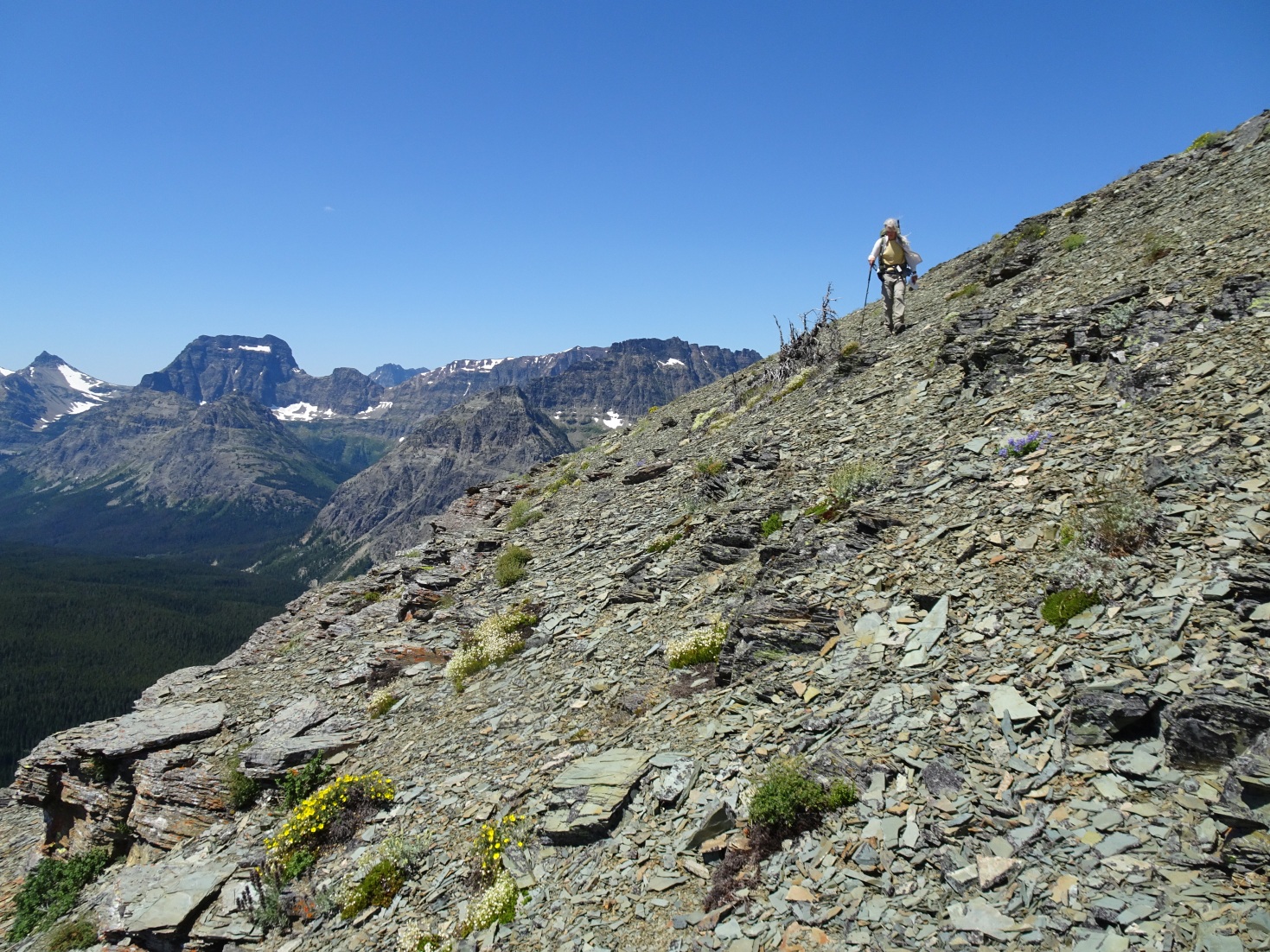 A dawn start is nice, as the ponds and eastern front can be spectacular in the morning (mist, alpenglow, etc.), and it gets you out of the hot low country while it is still cool. The mid-part of the trail is through the forest and is not as scenic – but scenery along the path up to the pass and onwards to the summit is spectacular with great views of the plains, and eventually the spectacular scenery of the Glacier Park summits. The trail and summit are uncrowded by Glacier NP standards – we ran into one other party on the summit as we were finishing our activation. This is Grizzly Bear country – so it is advisable that hikers carry bear spray. The climb is described with great detail and photos within Volume-2 of Blake Passmore’s excellent “Climb Glacier National Park” series.