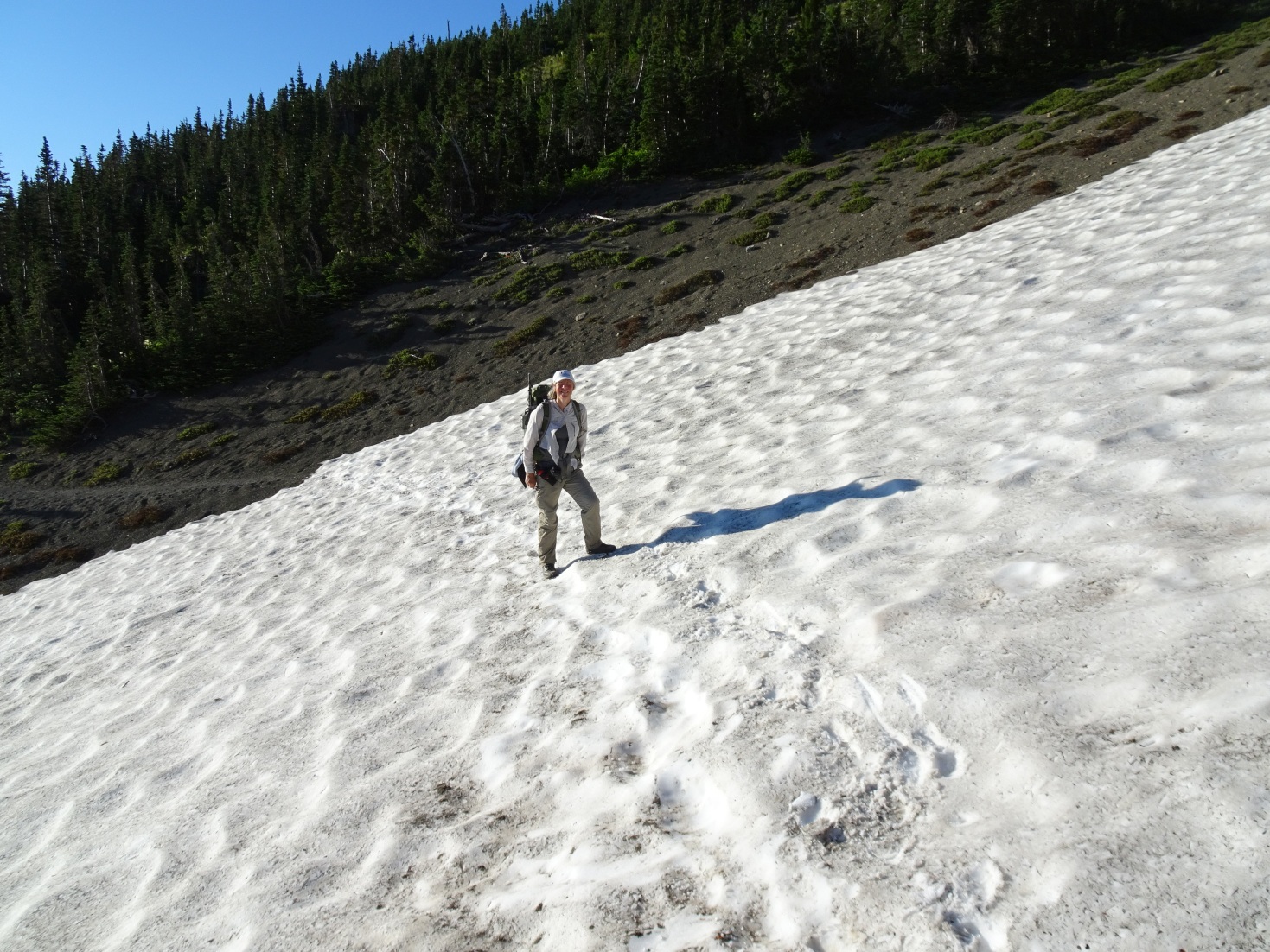On foot, cross the railroad tracks and begin hiking on the well signed and well maintained trail for 1.5 miles to its intersection with the Autumn Creek Trail. Turn right and follow the Autumn Creek Trail for about 1-mile to its junction with the Firebrand Pass trail. Turn left and follow this trail to the pass. There is a likelihood of early season snow drifts (through mid-July?), including a large snowdrift that may cover the trail on the east side of the pass. If the drift is present, its problematic nature will become evident as soon as you enter the upper basin immediately beneath the pass. In this case, watch for a well defined, unmarked trail that continues straight as the main trail cuts left and begins gaining elevation. The unmarked trail will take an easy path to the pass that bypasses the snowdrift on the right (north). Microspikes or other traction devices may be advisable if hiking before early July, but they were not necessary when we climbed in late mid July.