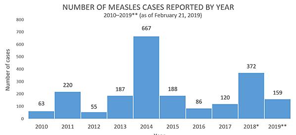 [7] Measles cases and outbreaks. Measles cases in 2019. Centers for Disease Control & Prevention. Updated Feb. 25, 2019.
