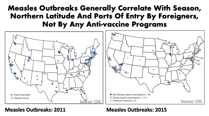 An interactive U.S. measles map posted at The Huffington Post online displays the geographical movement of measles outbreaks through the years 2009 to 2015.[6] It generally shows more northern latitude outbreaks and certainly does not coordinate with any anti-vaccine programs across the United States. Yet news headline after news headline blames anti-vaxxers for all of these so-called outbreaks.