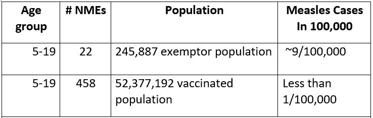 A report published in the Journal of the American Medical Association states unvaccinated children are 35 times more likely to experience a case of measles than vaccinated individuals (1992 data). ~9 cases of measles occur in 100,000 exempted children versus less than 1 case of measles in 100,000 of vaccinated children (see chart below).[28] But all this means is that unvaccinated children developed antibodies on their own to develop immunity rather than from weakened measles virus via a needle and syringe.