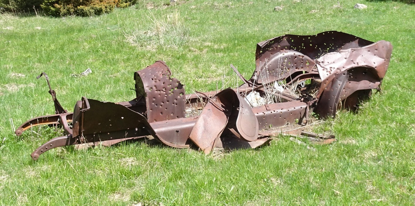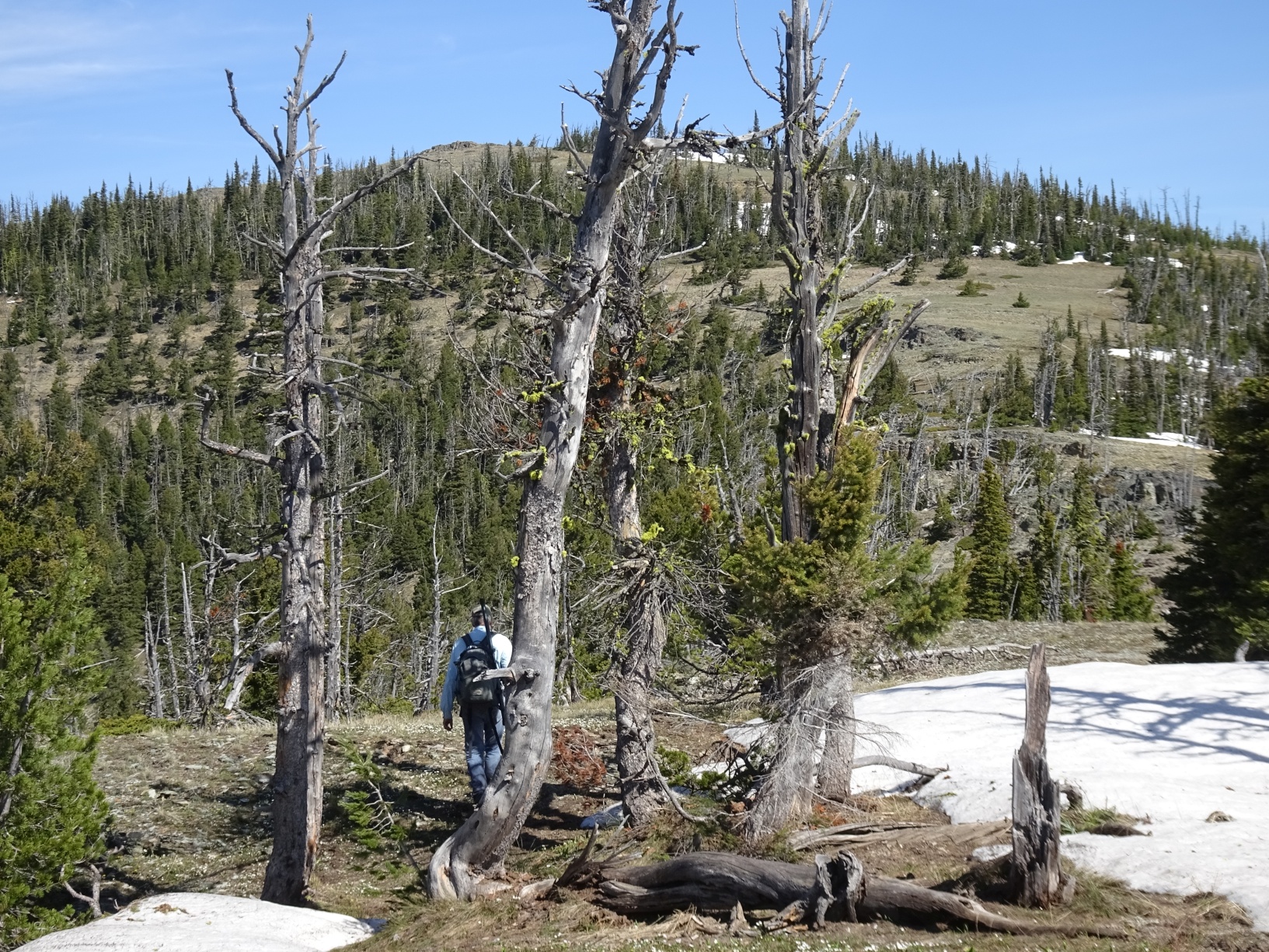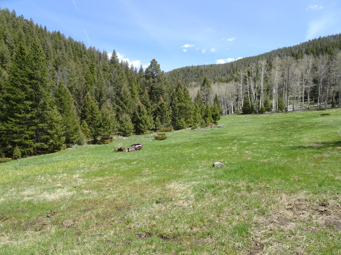 Hike up the ATV trail to a beautiful meadow with the wreckage of an old car where the trail splits. Continue straight (right) and follow the ATV track as it climbs up and to the left, then back to the right (west). The ATV track will intersect a good 4wd road near the ridge crest. Turn right (northerly) and follow the road beneath the power lines to an old Quarry. Leave the road to the right (northwest) near its terminus in the quarry and sidehill to the south saddle and ridge of Bear Mountain, crossing the barbed wire fence that is near the quarry. While the first portion of the bushwack is young, thick lodgepole, it quickly improves to become an open lodgepole forest with a floor of grouse whortleberry and grass. Follow the ridge up & bypass the large rock outcrop near the summit (see photo) on the right (east) via a steep earthen gully. Upon reaching the summit ridge, traverse approximately 100 yards northeast to reach the actual summit.