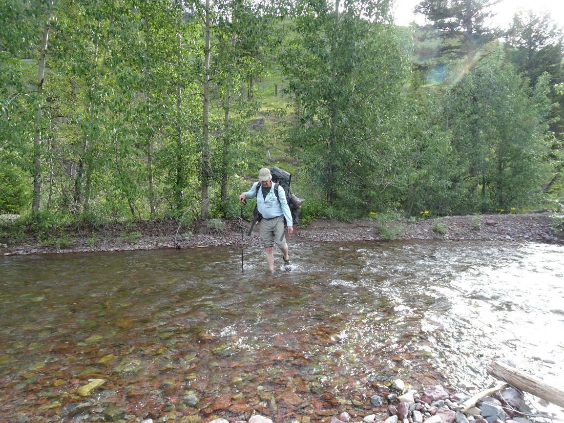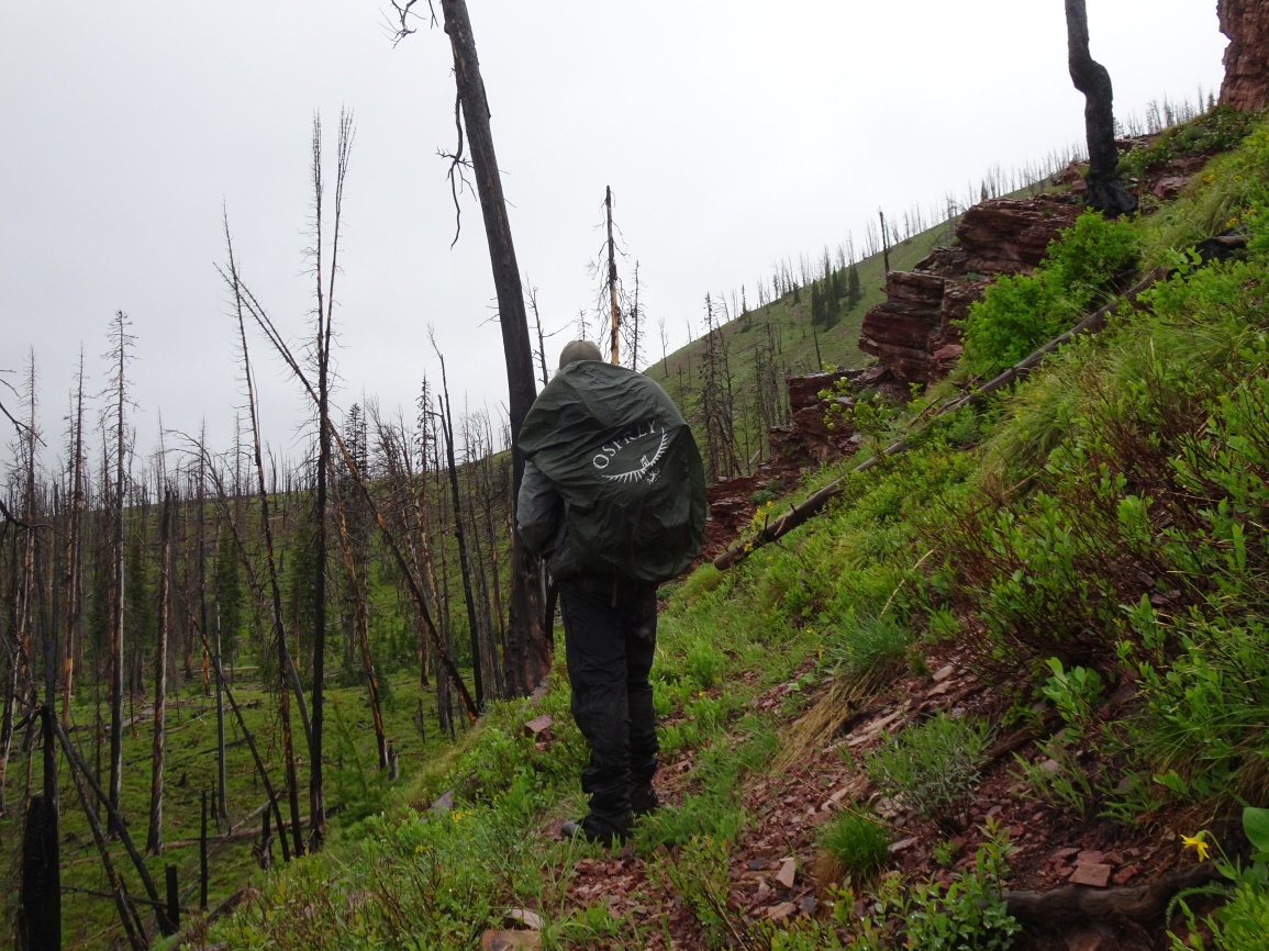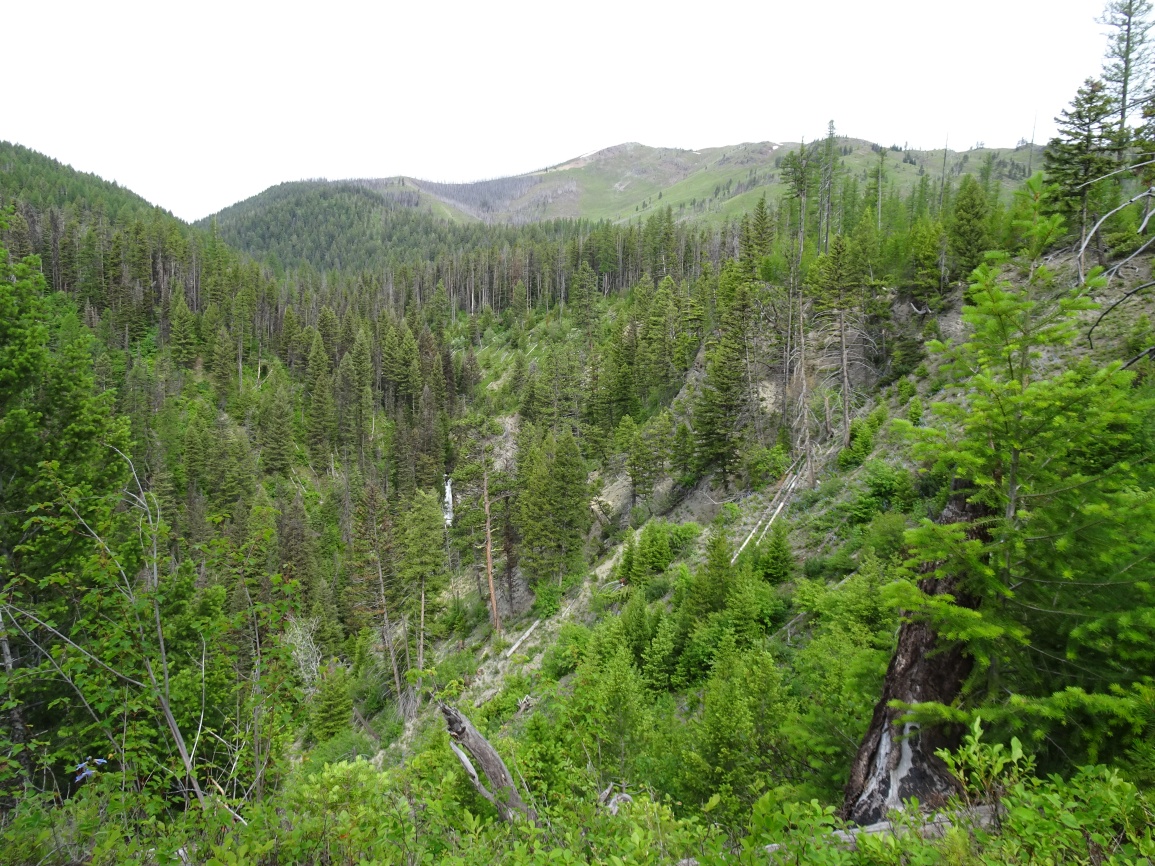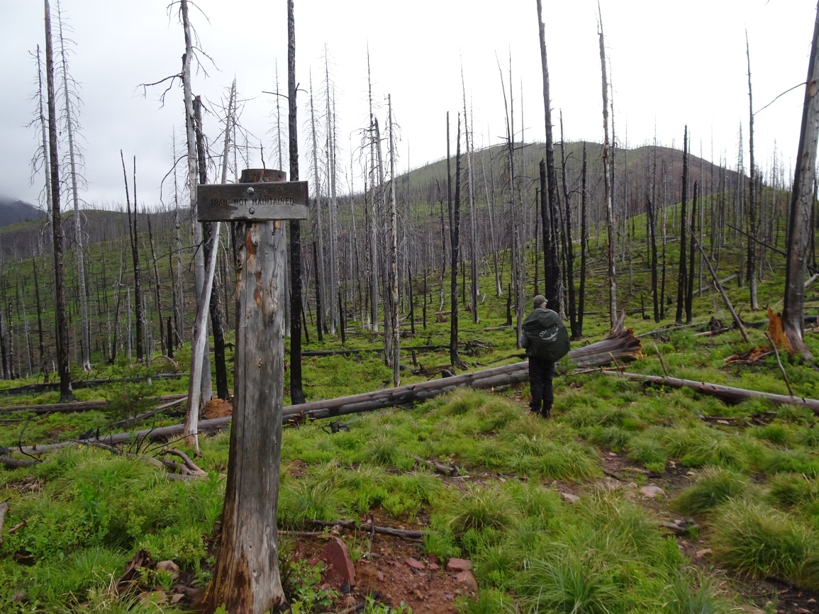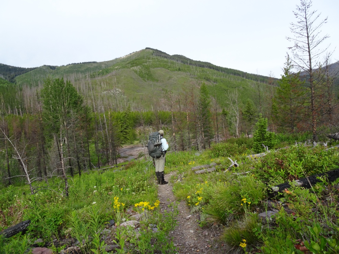 Hike north from the N. Fork Trailhead on the North Fork of the Blackfoot River and turn left (west) on Tr. 061 (Lake Creek Trail) after about 0.6 miles. The trail is well defined and gets cleared early in the season. Follow the broad Lake Fork Valley up about 2.2 miles to the shallow ford. Shortly after crossing the creek, the trail will begin climbing. There is a nice overlook of some falls on the West Fork of Lake Creek part way up. The trail climbs at a steady grade before leveling out around 6,200 feet in a beautiful open hummocky area that has nice views of the surrounding country. Soon the trail drops down to Lake Otatsy. Continue straight (left) at the trail junction at the outlet for Lake Otatsy and continue up past Camp Lake to Camp Pass on Tr. 16. The trail from Camp Pass (Tr. 166) is marked by a “trail not maintained sign”. It is much fainter, but generally follows the track on the USGS Quadrangle. Follow the tread where it is evident, and the mapped position on the USGS Quadrangle where it isn’t. There is some deadfall near the beginning of Tr. 166, but nothing particularly problematic. Leave the trail to climb the gentle north ridge to the summit. It is likely that there are nice view from the summit, but it was socked in when we were there.