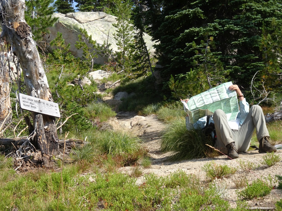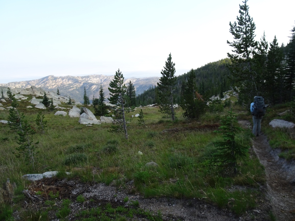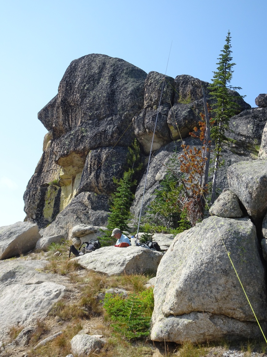The trail is very well maintained and leaves from the east side of the parking lot. Follow the trail over the shoulder of Elk Mountain, then down its north ridge through a pretty meadow, and onwards as it descends towards Bilk Mountain. The trail switchbacks steeply down the east side of the ridge, then contours around the south slopes of the Bilk Ridge before climbing back up to a trail junction in the saddle on the southeast side of Bilk. Continuing straight will take you to good camping beside Goat Creek, a steep 400-feet below. Turning left at the trail junction will take you to Bilk Mountain. There are several false summits, so it is advisable to take care that you are within the activation zone. The true summit is a rock knob that I did not attempt to scale. I found a nice place to setup the antenna at the base of the rock knob - perhaps 20-feet below the true summit. We went on to camp at Grave meadow.