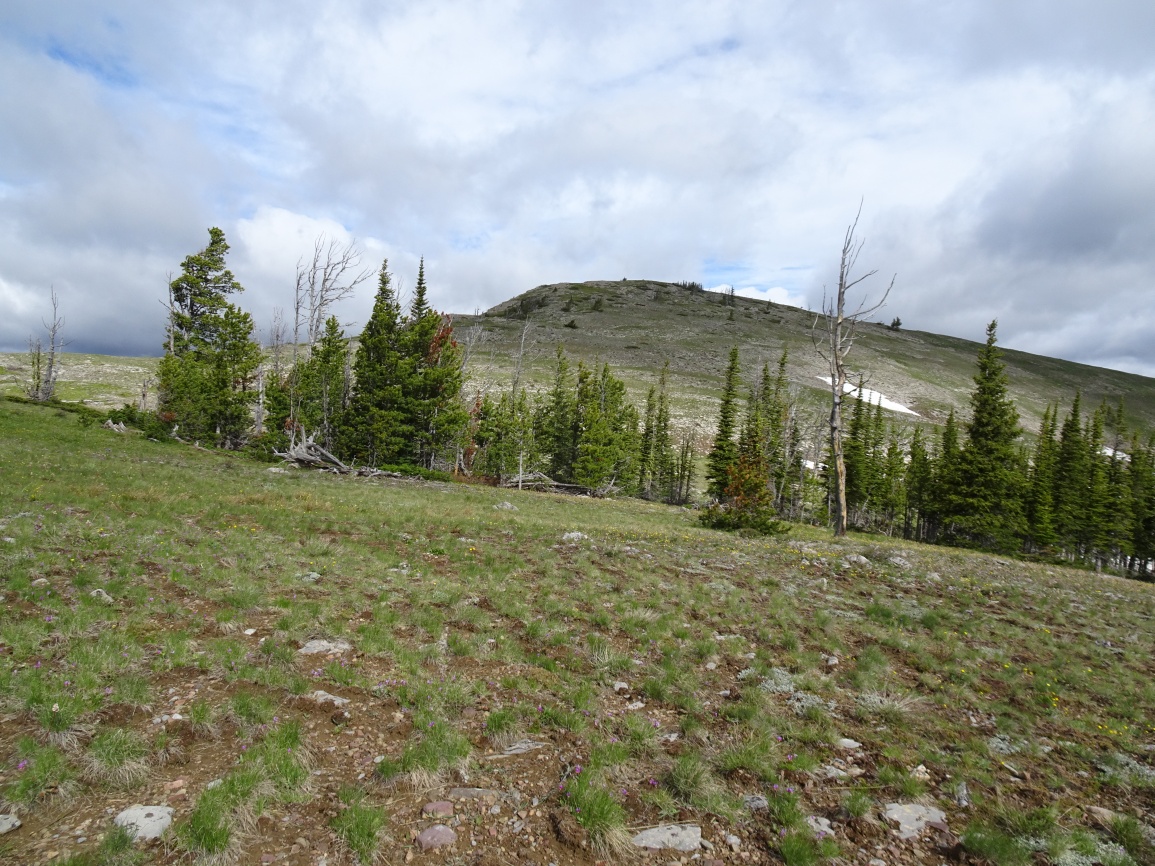From the mouth of Dwight Creek, walk across the meadow to the nose of the Danaher Ridge and begin climbing the Omar Mountain trail. Continue up the trail a short distance and turn off to the right when it first begins to become less steep. It is better to turn off sooner rather than later since the south (left) side of the Danaher Ridge is a bit steep and cliffy. Follow the ridge upwards through the timber. The timber soon thins out making for a very beautiful ridge climb through open meadows. Danaher Mountain is a dual summit, with the higher point being the further summit that is to the northwest. The summit is on the divide between the Scapegoat and Bob Marshall Wilderness areas and has great views in all directions. The Jumbo Mountain lookout can be seen in the distance to the northwest, and the Prairie Reef Lookout can be seen far to the North. This is prime Grizzly habitat, so stay bear-aware.