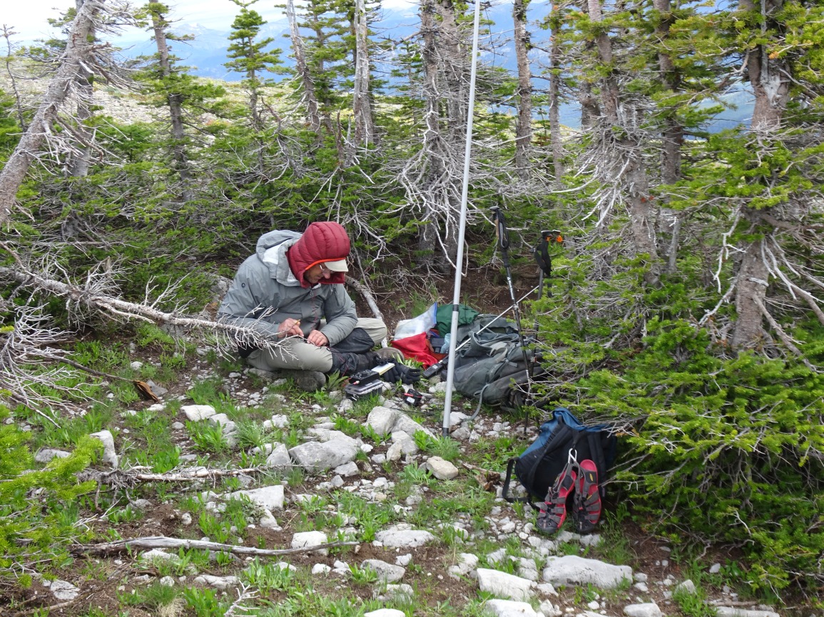 Hike north from the N. Fork Trailhead. We turned left (west) on Tr. 061 (Lake Creek Trail) after about 0.6 miles to combine this summit with Spread Mountain (W7M/GA-079), but it is more direct to continue up the North Fork of the Blackfoot, and then turn left (west) up the Dry Fork after reaching the North Fork Cabin. The trails up the North Fork and the Dry Fork are heavily used and get cleared early in the season.