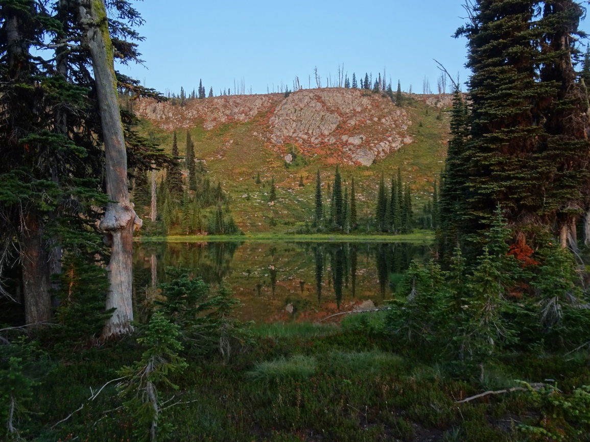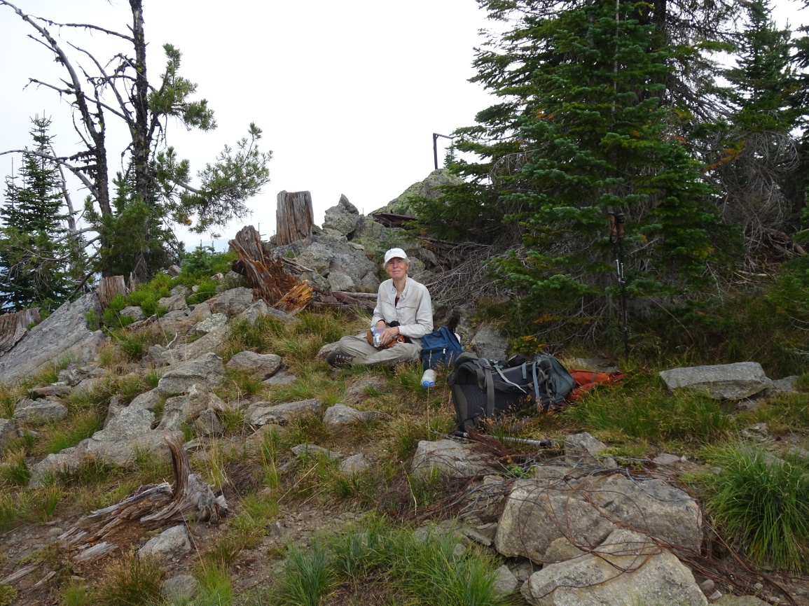 It is reported that an L-5 type lookout was constructed atop a 35-foot platform tower in 1932, but only bits of the foundation and scattered debris remain. The summit is the on-trail highpoint of a spur ridge that extends north from the east-west Indian Hill to Indian Park Ridge and has fantastic views in all directions. We camped at Buck Lake, but there is also likely camping at Highline Lakes, Drake Saddle, and further west along Tr. 602. There is water at Drake Saddle, but the area is burnt and has much standing dead timber.