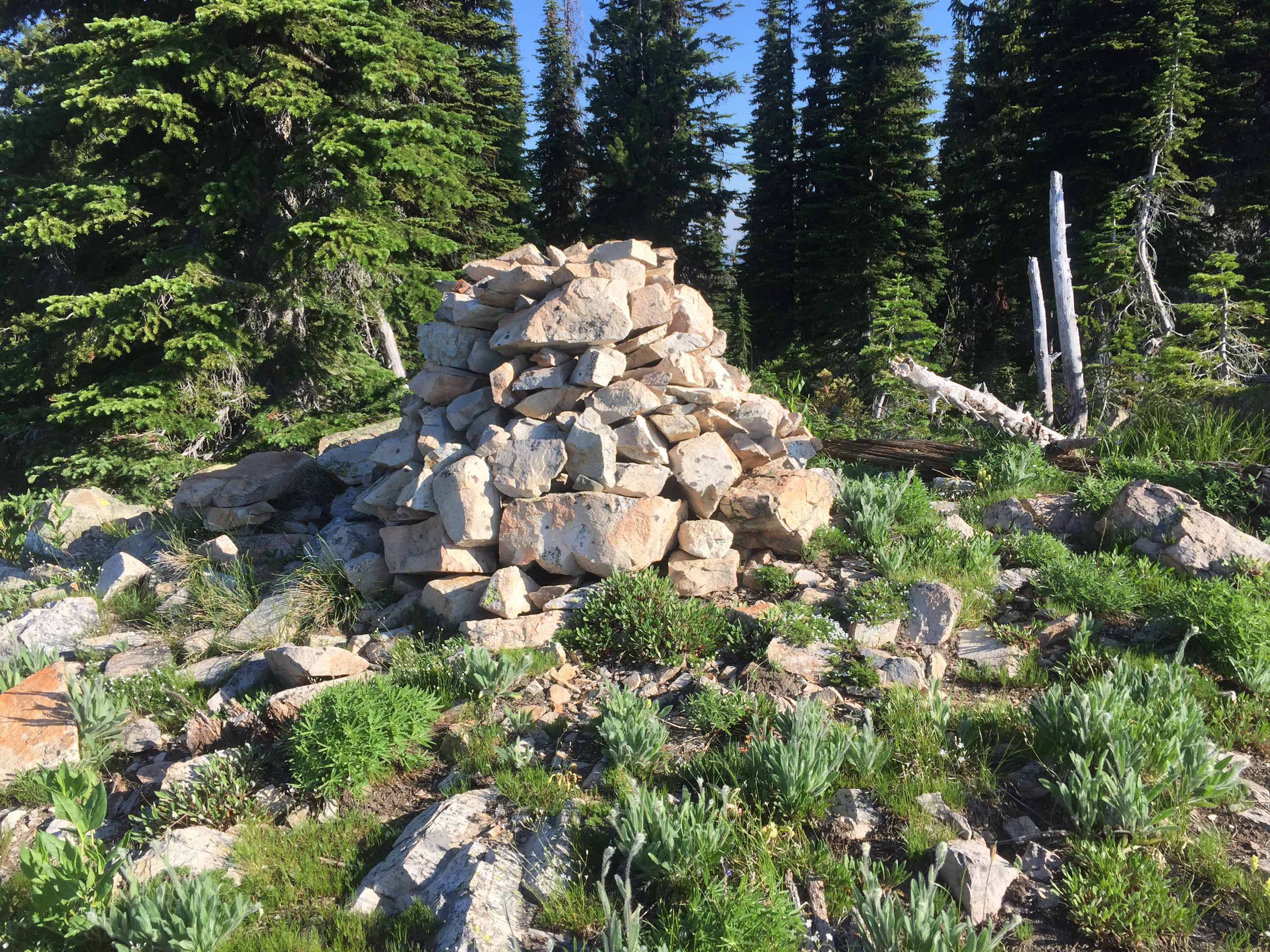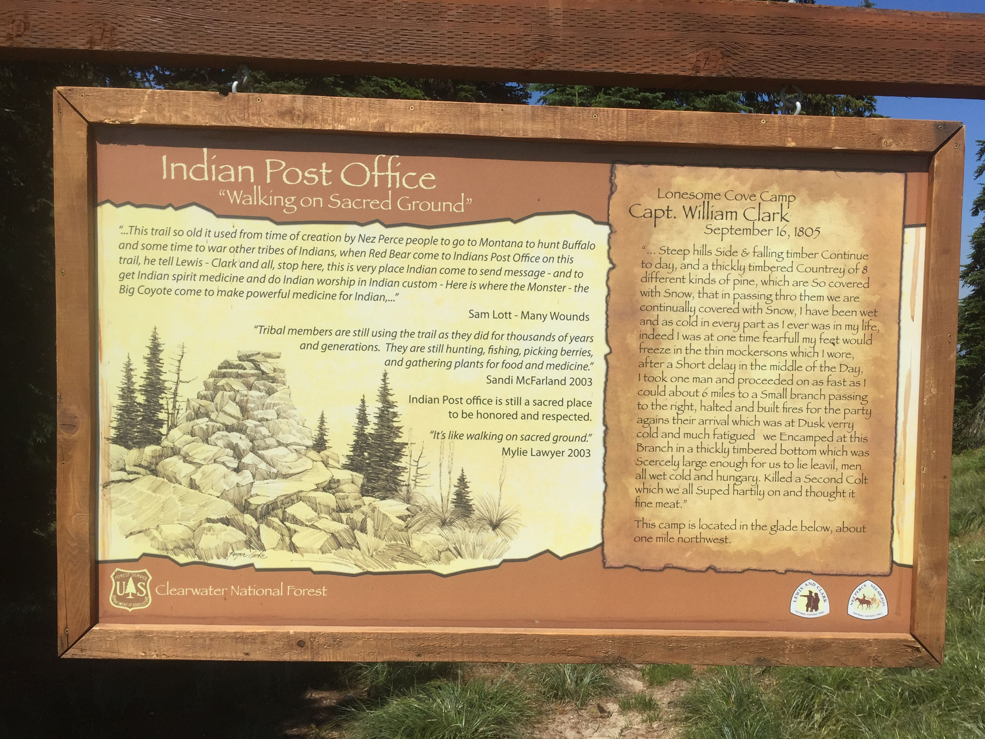 Indian Post Office is an intriguing name given to a rounded high point qualifying as a SOTA summit along the Nee Me Poo, a trail of the Nez Perce and the Lewis and Clark trail. I searched the few vertical rock outcrops looking for what I thought might be pictographs or petroglyphs. I found neither. I did see a large rock cairn linked to folklore. I gave it little significance except for taking a picture until I read an interpretive sign and this article from a University of Idaho post. https://www.lib.uidaho.edu/special-collections/dm/dm1998/postof.html.