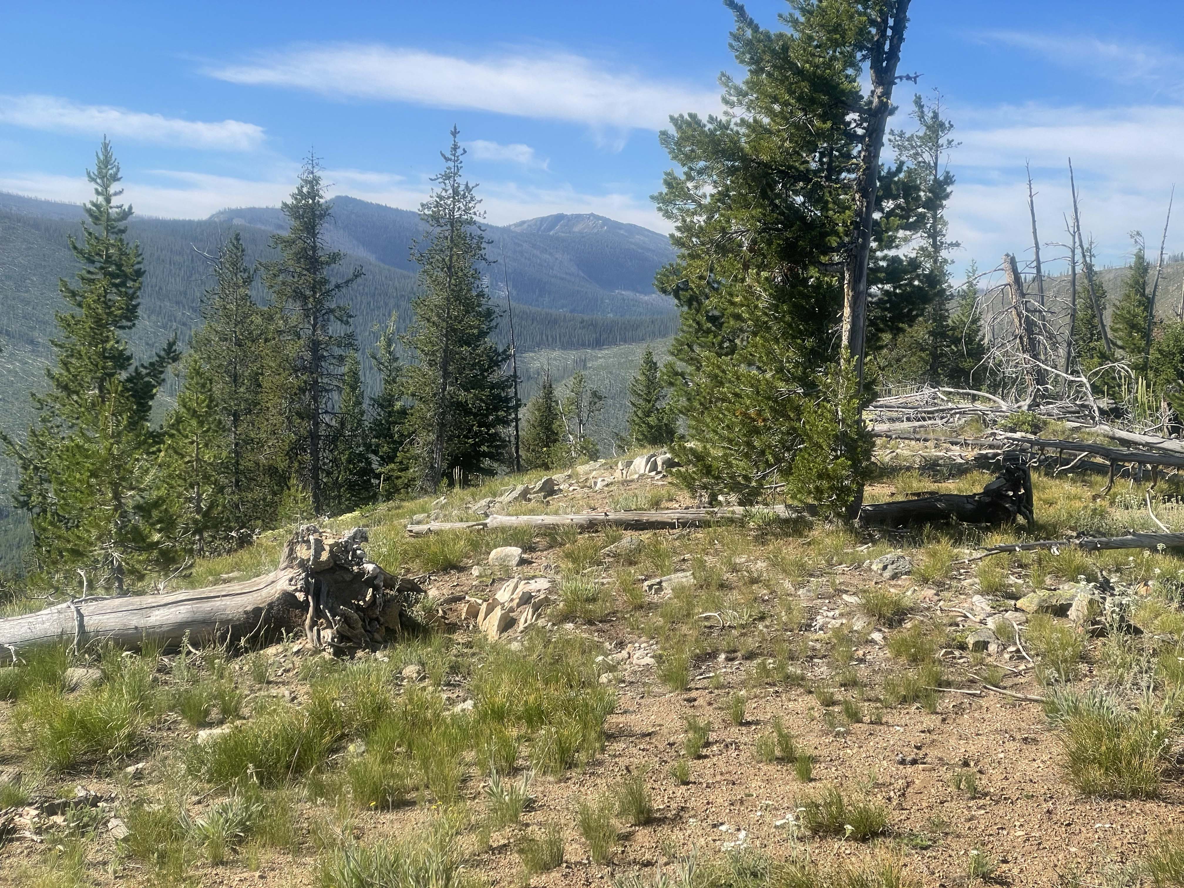 SOTA Summit 7560 could easily be termed “Magruder Ridge High Point”. It is located on Magruder Ridge approximately 1.0 mile south of Magruder Mountain that it dominates by a mere 138’. Magruder Mountain and Ridge are named for the massacre of Lloyd Magruder and his party of four others in 1863 near this area. See sign photo. The summit is mostly forested but has views of other highpoints in the Selway Bitterroot Wilderness and Salmon Mountain Lookout in the Frank Church River of No Return Wilderness.