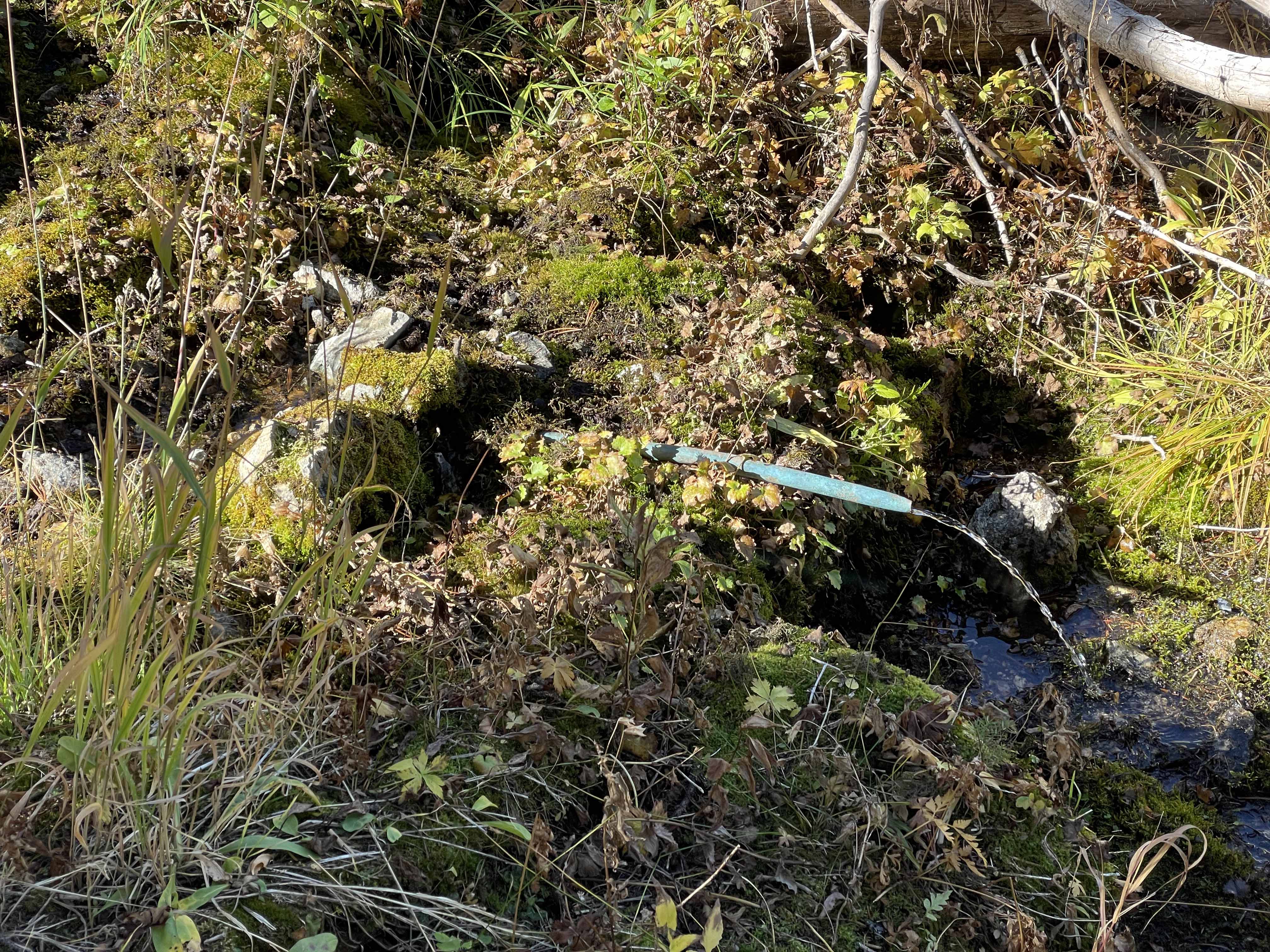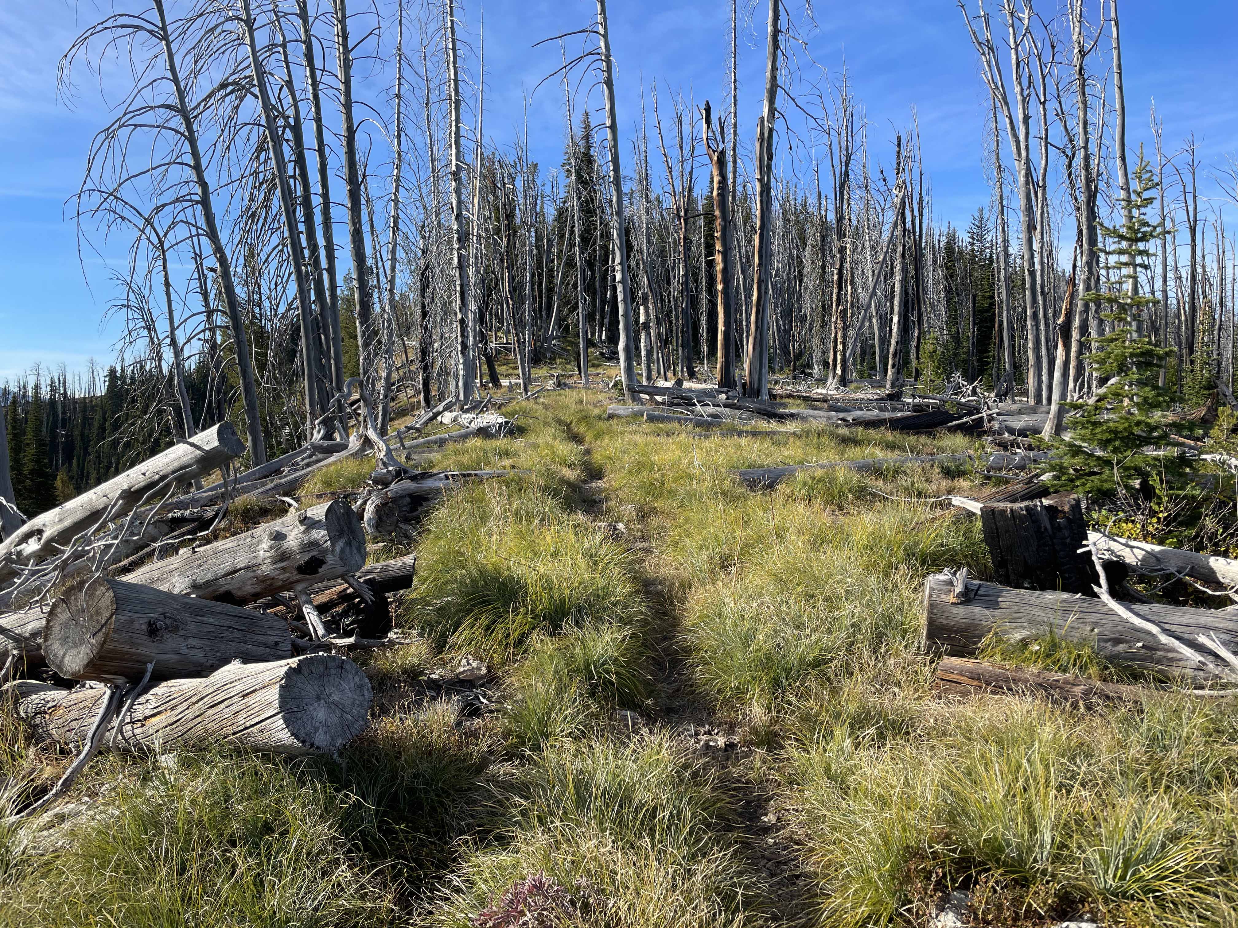 This un-named summit is near US Forest Service trail #313 south from Skalkaho Pass. The trail begins in a regenerated timber harvest unit and quickly transitions to old-lodgepole pine/Rocky Mountain subalpine fir forest partly burned by a wildfire in the early 2000’s. Most of the trail is within this wildfire and is dominated by snags and windfall trees. Use caution traveling this area especially on windy days. In approximately one mile the trail enters a moist unburned large wet area dominated by large spruce. As the trail climbs out of this draw and along an increasing steep hillside there is a permanent spring complete with a pipe for filling water containers. This spring is depicted on the US Forest Service 2016 topographic map.