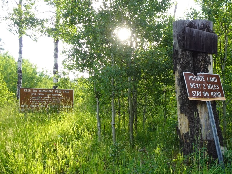 Beginning at the junction of Highways 89 and 87 near the Armington Junction Rest Area, travel southeast on Highway 87 for 700 feet and take the first left on Armington Road (beneath the railroad overpass). Follow Armington Road north 1.1 miles to the junction with Willow Creek Road. Turn right (northeast) on Willow Creek Road. Follow Willow Creek Road 9.2 miles east and watch for a road that “T’s” into Willow Creek Road from the North. Turn left – this is still “Willow Creek Road”. Follow this road as it descends to Little Belt Creek and follows the creek upstream to the northeast. There will be a “Y” after 2.3 miles. Stay right at the “Y” on Pinewood Lane and continue upstream in the Little Belt Creek drainage. Continue following Pinewood Lane for 1.2 miles where a road will “T” in from the left (north). Note that there are signs at this junction that identify USFS access (see photos).