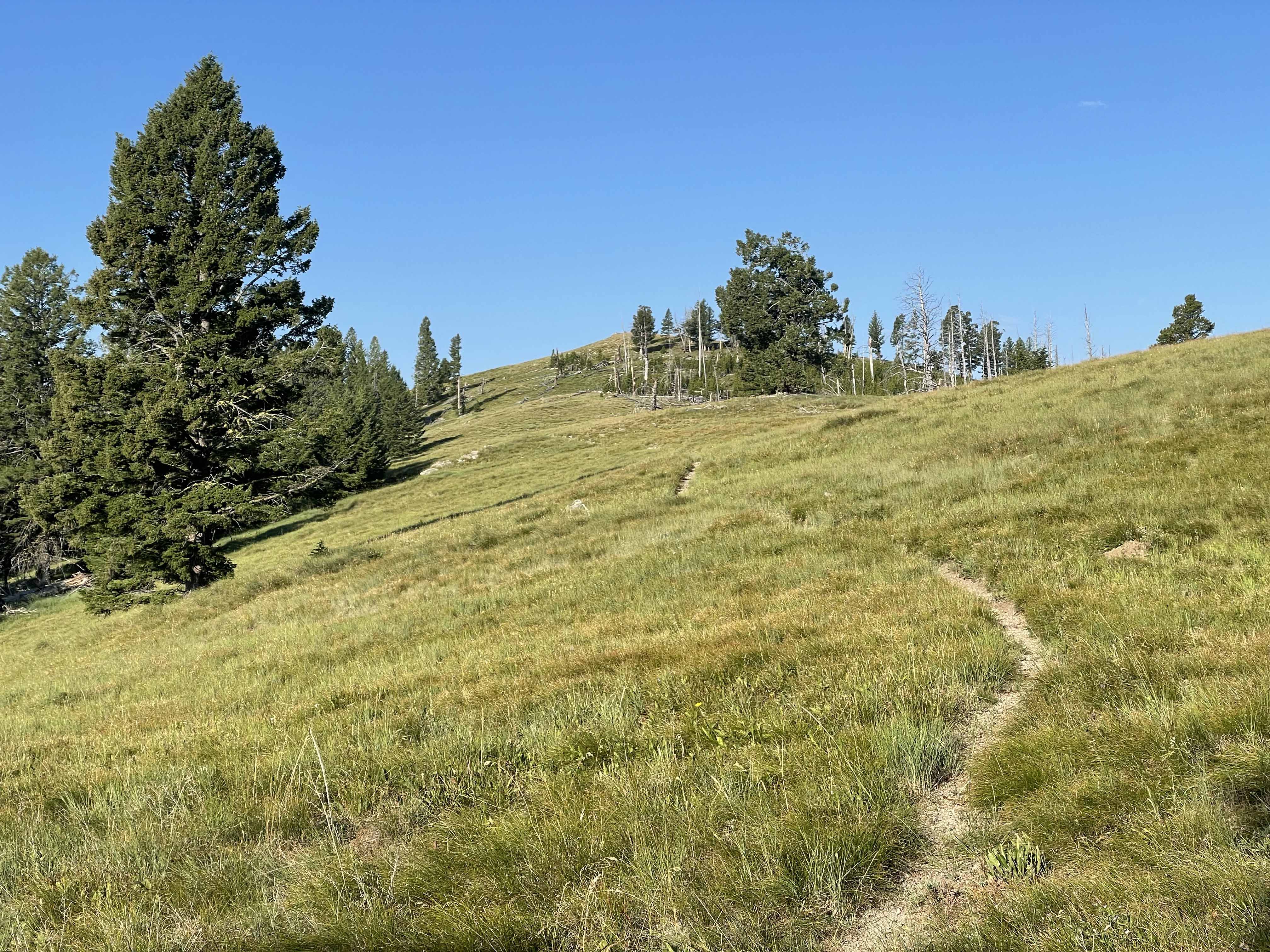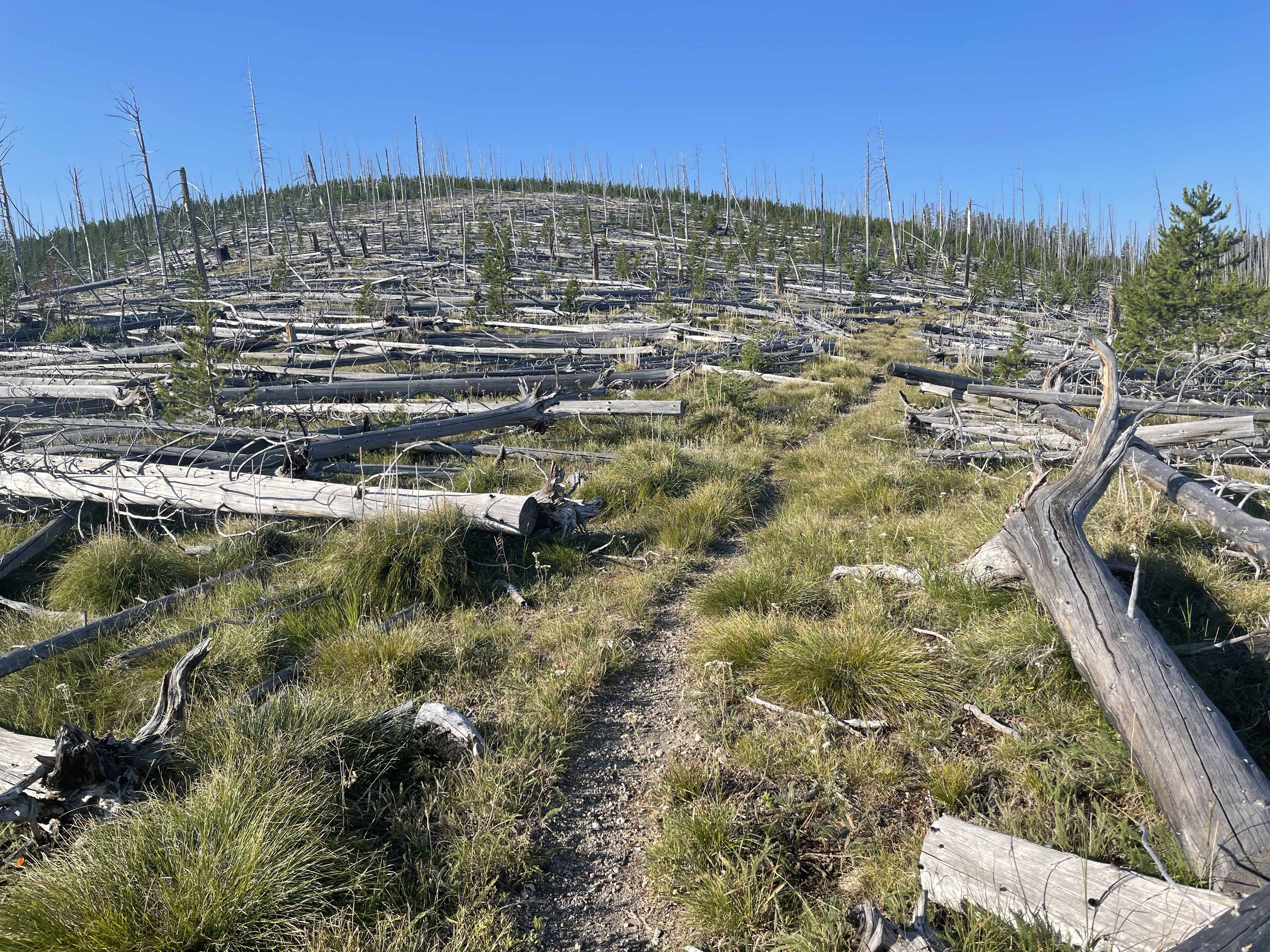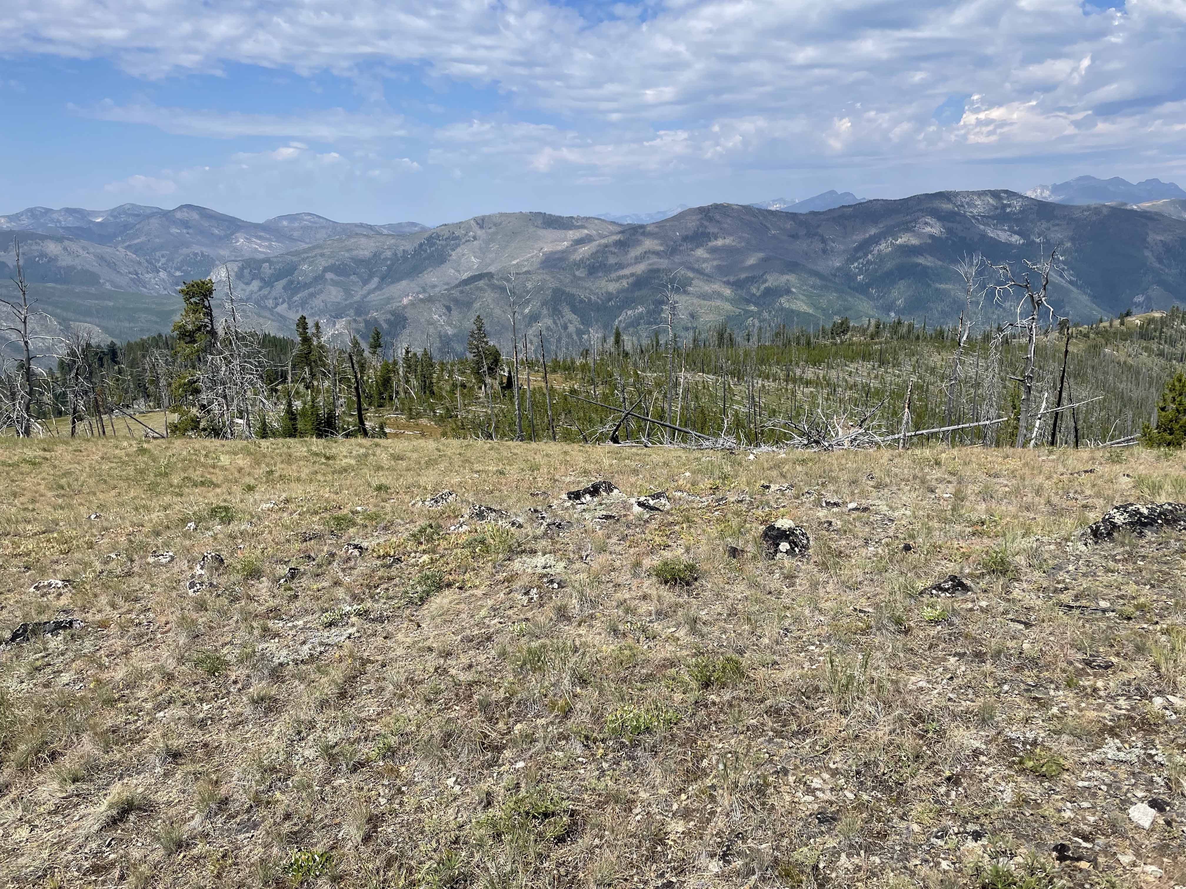 This unnamed summit is a bald rocky grassland overlooking a large mostly roadless area (Allan Mountain 01946) and the southern end of the Selway-Bitterroot Wilderness Area. It has a very good trail, FS #178 due in part to regular trail maintenance through a huge amount of fire-killed fallen trees. The hike also travels through large southerly-aspect grassland-slopes that could be quite warm during mid-day summer months.
