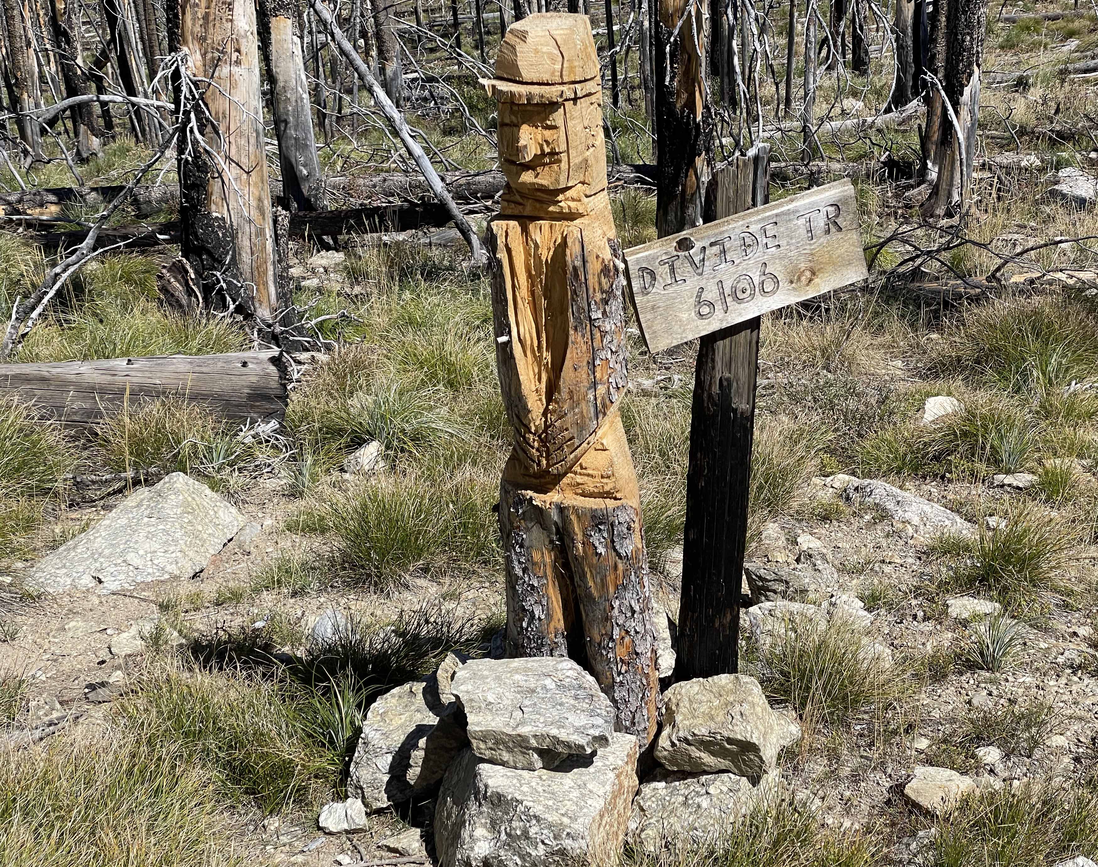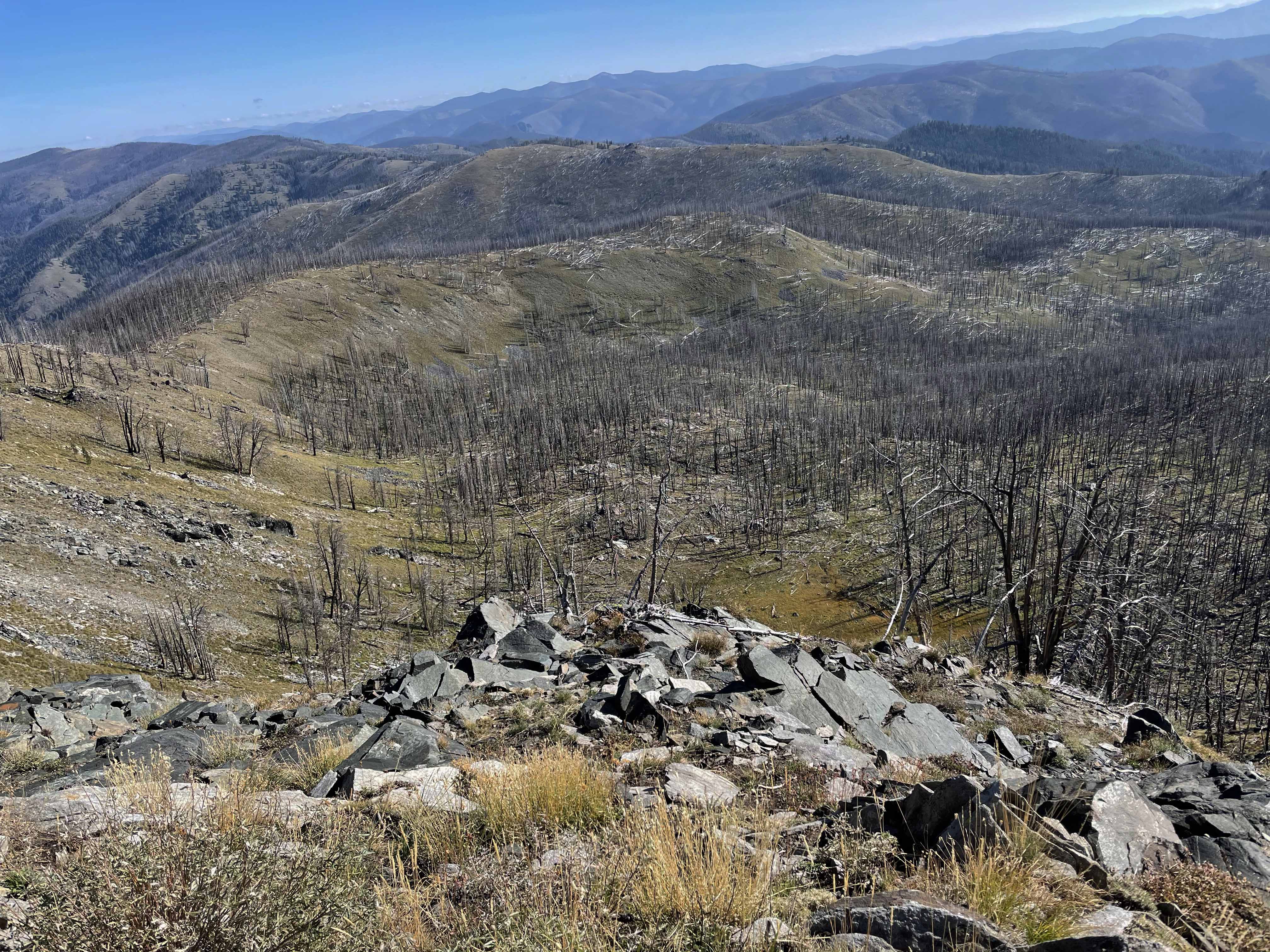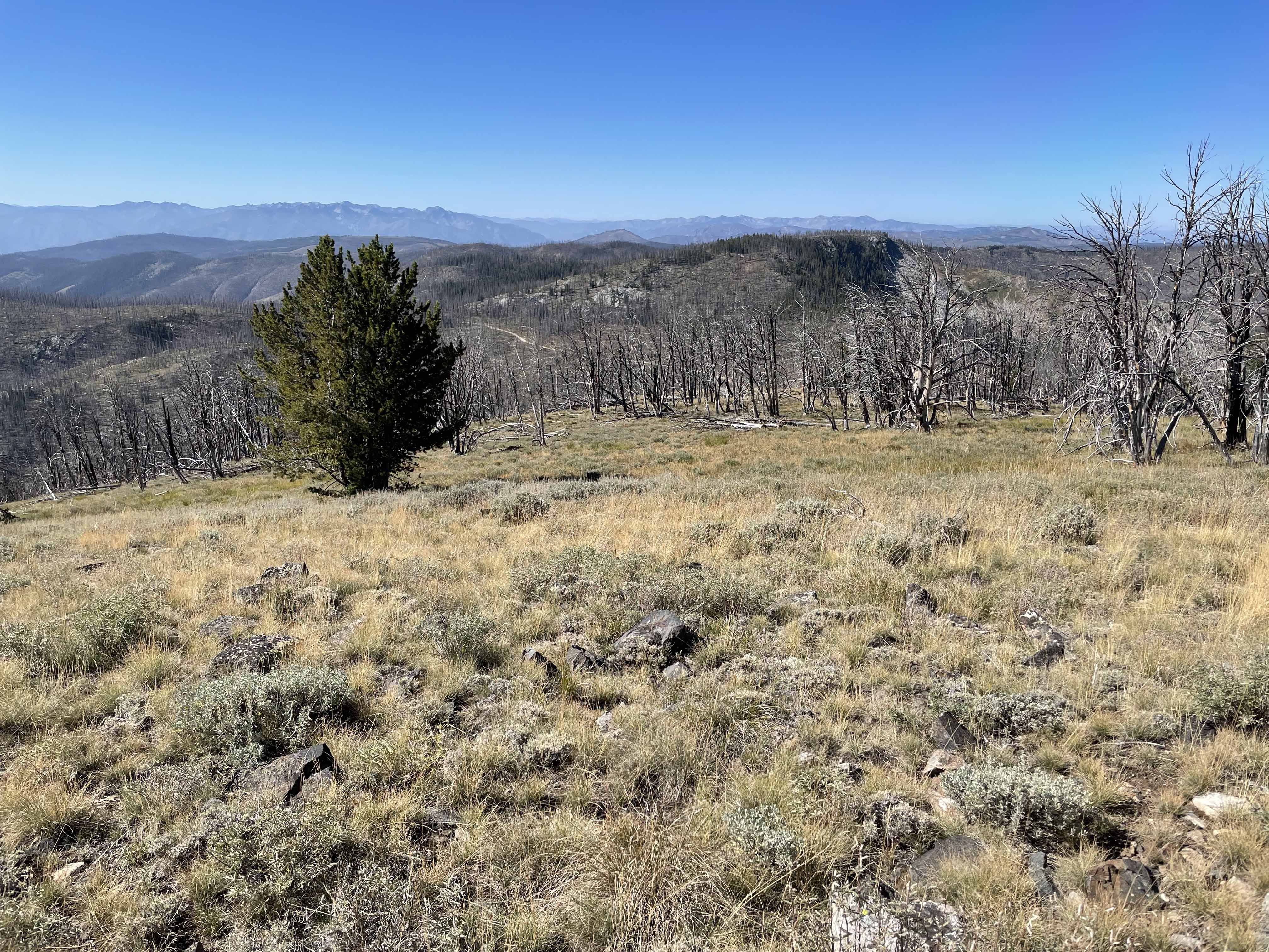 This is a burned-over scattered forest summit with few live trees. Parking at the trailhead is limited but several places within 200’ exist. Finding a place without snags limited parking to a couple of areas west of the trailhead at the curve in the road. The one above the road is near an Idaho/Montana boundary post. That post was placed in 1905 at mile 393.121 per information received from W7LIX.